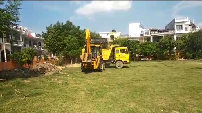 सेक्टर एन-1 में पार्क की सफाई के लिये लगी नगर निगम की टीम