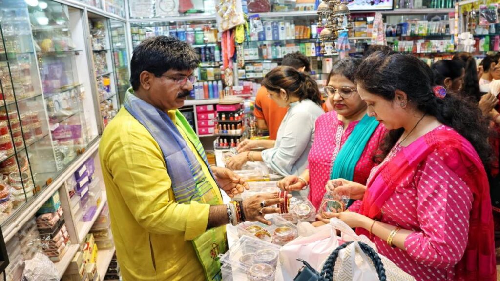 अलीगढ़। इगलास क्षेत्र से लगातार दूसरी बार भाजपा के विधायक राजकुमार सहयोगी बृहस्पतिवार को करवाचौथ के दिन ग्राहकों की भीड़ को संभालने के लिए परिजनों व स्टाफ संग अपनी चूड़ियों की दुकान पर रहे। इस दौरान उन्होंने खुद चूड़ियां बेचीं और ग्राहकों को उत्पाद दिखाकर उन्हें संतुष्ट किया। इस दौरान बातचीत में एक ही बात कही कि विधायकी अल्प समय के लिए, मगर व्यापार जीवन भर का है।