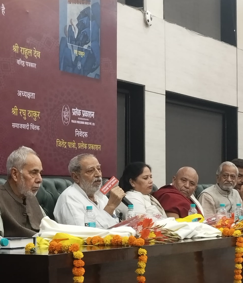 नई दिल्ली । 13 नवंबर को एक पुस्तक का विमोचन नई दिल्ली के कांस्टीट्यूशन क्लब में हुआ जिसका शीर्षक स्वप्न,विकल्प और मार्ग है । इस मौके पर पुस्तक के लेखक रघु ठाकुर सहित देश के कई सामाजिक राजनीतिक लोग मौजूद रहे। लोकतांत्रिक समाजवादी के संरक्षक रघु ठाकुर ने अपने विचार व्यक्त करते हुए कहा कि समाजवाद ही देश और दुनिया को बचा सकता है। देश और दुनिया की व्यवस्था को बेहतर करने के लिए जो भी लड़ेगा उसे अपमान सहना ही पड़ेगा। सुप्रसिद्ध समाजवादी चिंतक रघु ठाकुर ने आज दिल्ली के कांस्टीट्यूशन क्लब में अध्यक्षीय उद्बोधन देते हुए यह बात कही। रघु ठाकुर ने शिक्षा के निजीकरण की समाप्ति को जरूरी बताया। उन्होंने हथियार उद्योग को देशों के विकास में सबसे बड़ा रोड़ा बताते हुए कहा कि हमें समाज को निर्भय बनाना है, इसलिए ऐसे लोगों को ही आयोजन में बुलाया जाये जिन्हें न किसी से भय हो न सुरक्षा की जरूरत।