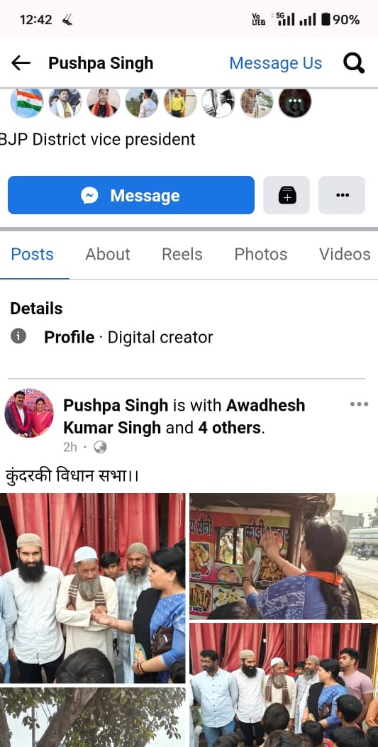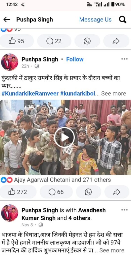 पुष्पा सिंह ने अपने फेसबुक पर दो पोस्ट डाला है। पहले पोस्ट में वे बच्चों के साथ घीरी हैं और लिखा है कि कुंदुरकी में ठाकुर रामवीर सिंह के प्रचार के दौरान बच्चों का प्यार…। दूसरे पोस्ट में अल्पसंख्यक समाज के नागरिकों के साथ वार्ता कर रही हैं। दोनों पोस्ट को भाजपा कार्यकर्ताओं ने शेयर किया है। द संडे व्यूज़ के पास भी दोनों पोस्ट आया और कार्यकर्ताओं ने सवाल किया कि क्या पुष्पा सिंह के आने से कुंदुरकी सीट भाजपा के हाथ से फिसलने वाली है? किसके कहने पर पुष्पा सिंह यहां आयीं,इससे पिछड़ी जाति का वोट भाजपा के पाले से निकल जायेगा…।