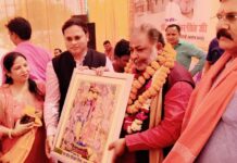 कतारबद्ध होकर बाबा के चरणों में श्रद्धा अर्पित कर रहे श्रद्धालु