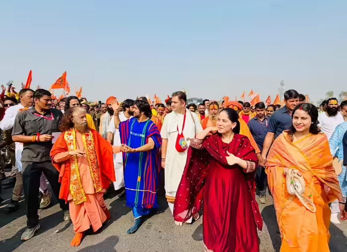 सनातन हिंदू एकता पदयात्रा की फोटो में जया किशोरी सड़क पर आगे चलती नजर आ रही हैं। दुपट्टा संभालते हुए बेहद सुंदर दिख रही हैं। वहीं, बागेश्वेर बाबा पीछे से आते दिख रहे हैं। देसी अंदाज की बात करें तो जया ने हमेशा की तरह सिंपल पहनावा ही दिखाया। लेकिन सूट का लाल रंग उनकी सुंदरता को दोगुना करता नजर आ रहा है।