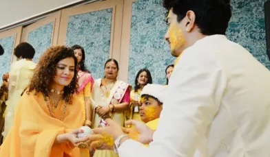 तस्वीर में वह गुलाबी रंग के कढ़ाई वाले लहंगे में बेहद खूबसूरत लग रही हैं। दुल्हन बनने वाली स्मृति जहां बैंगनी रंग की ड्रेस में बेहद खूबसूरत लग रही थीं, वहीं पलाश सफेद कुर्ता-पायजामा और सुनहरे रंग की जैकेट में बेहद हैंडसम लग रहे थे। इस कपल की हल्दी की रस्म 21 नवंबर को हुई। समारोह की तस्वीरें और वीडियो जल्द ही ऑनलाइन वायरल हो गए।