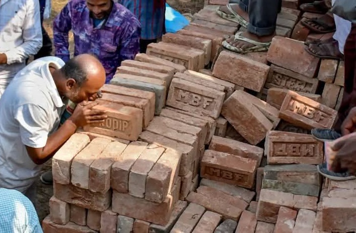 आसपास के इलाकों से सिर पर ईंट रखकर पहुंचे लोग